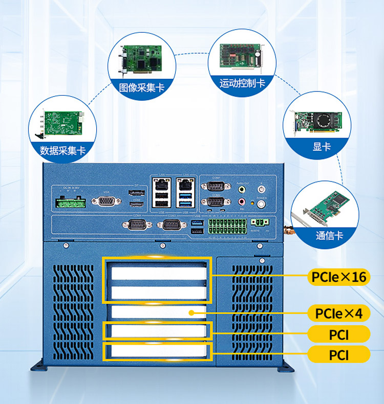 四卡槽版搭載1*PCIe X16、1*PCIe X4、2*32bit PCI共四個擴展插槽,支持高速GPU、圖像采集卡、運動控制卡、AI加速等功能配置,可增強特定工業應用的硬件拓展和功能定制彈性。